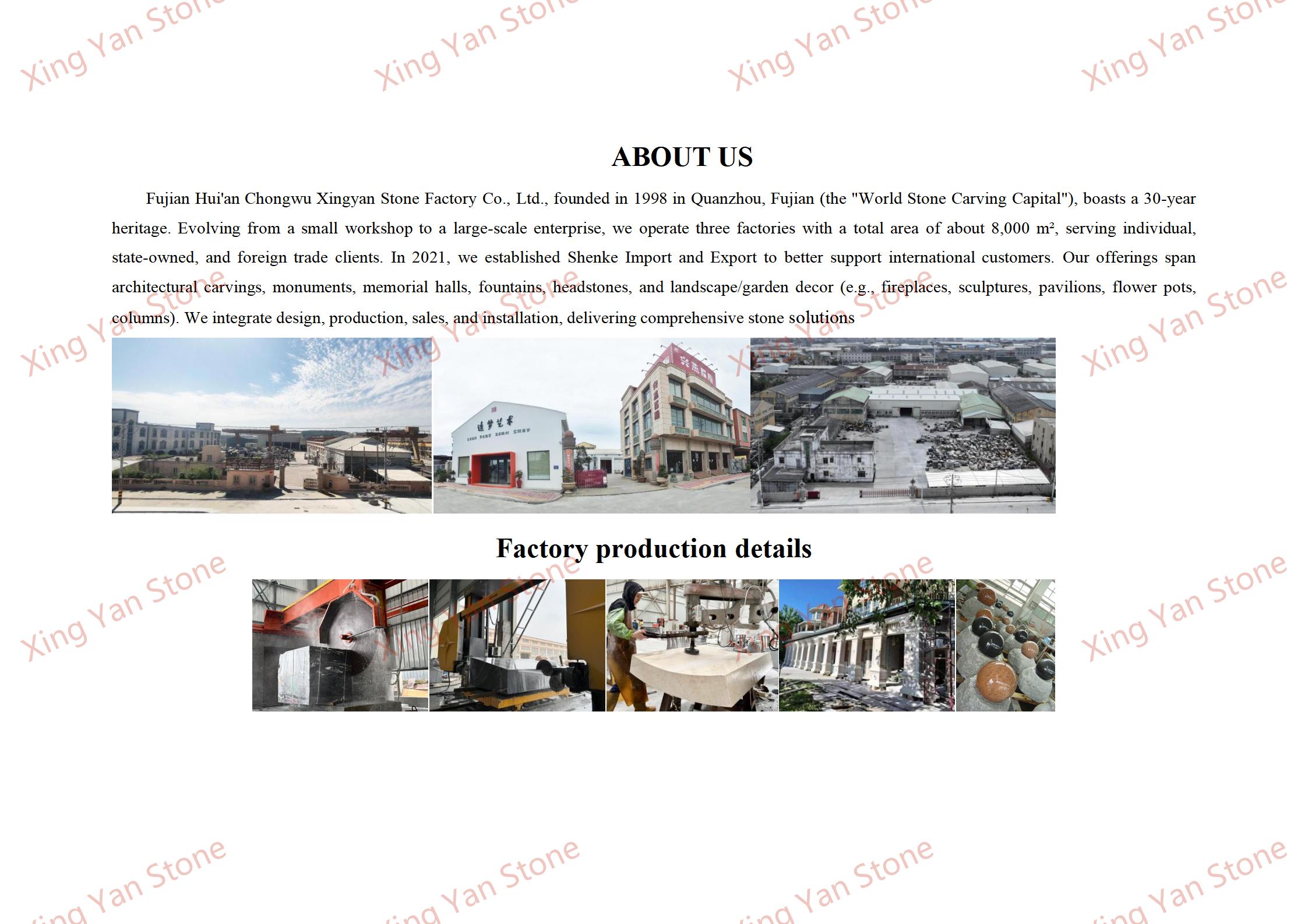 Материал: таңдалған көп түсті гранит бөліктерінен жасалған. Ақ және қызғылт-қоңыр-қоңыр гранит қатты және түссіз. Жылтыратудан кейін бетінің жылтырлығы жоғары және оның формасы мен түсін ұзақ уақыт бойы ашық жерде сақтай алады.